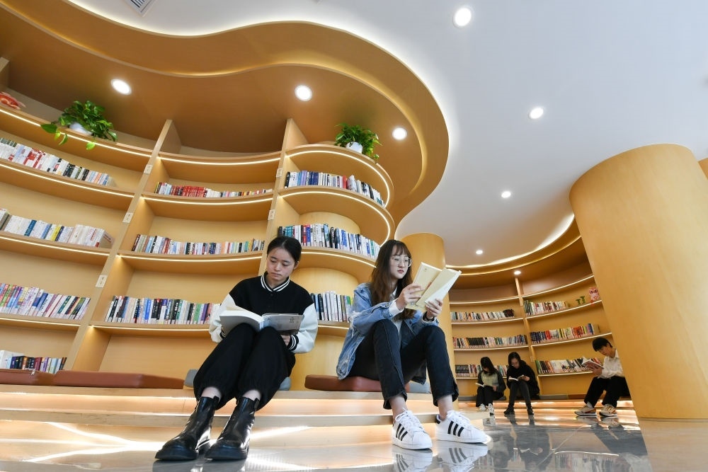 市民在江蘇省張家港市沙洲湖益空間·源書(shū)房?jī)?nèi)閱讀(2023年4月21日攝)。新華社記者 李博 攝