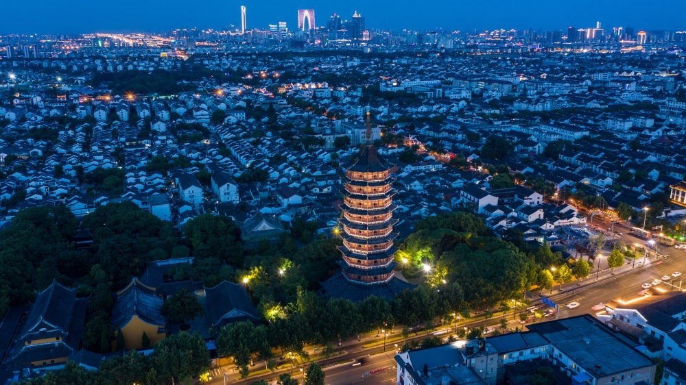 這是2020年8月24日在蘇州市姑蘇區(qū)拍攝的城區(qū)夜景(無(wú)人機(jī)照片)。新華社記者 李博 攝