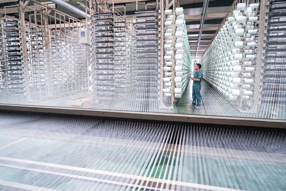 工人在位于蘇州市吳江區(qū)盛澤鎮(zhèn)的恒力集團(tuán)博雅達(dá)紡織智能車(chē)間作業(yè)(2021年5月14日攝)。新華社記者 李博 攝
