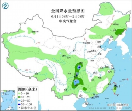 6月1日08時至2日08時,吉林東部、西北地區(qū)東南部、西南地區(qū)東部等地部分地區(qū)有中到大雨,其中,臺灣島北部、四川東北部等地部分地區(qū)有暴雨(50~95毫米)。內蒙古、東北地區(qū)、浙江、福建沿海、臺灣島等地部分地區(qū)有4~6級風。東海南部、臺灣以東洋面將有7~8級風,陣風9級。