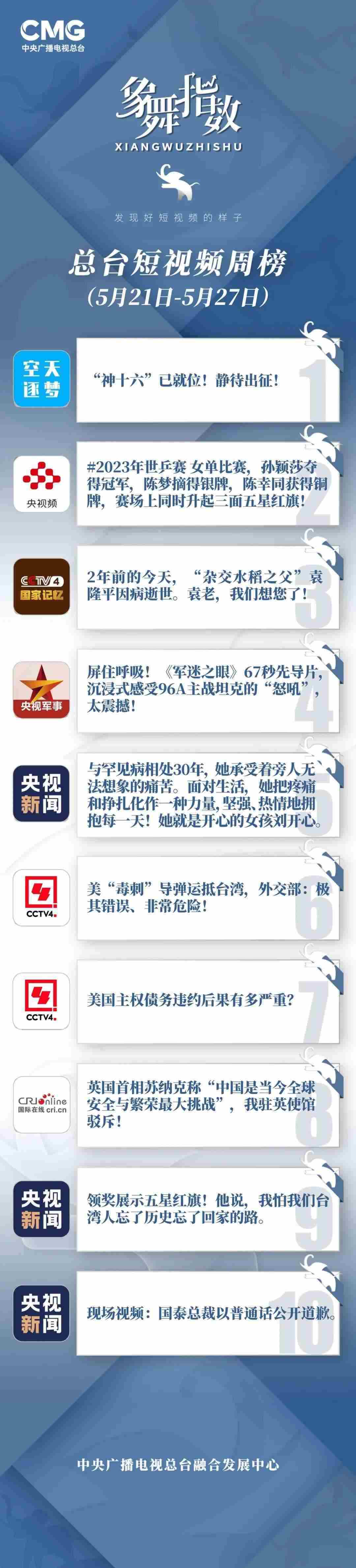 中央廣播電視總臺“象舞指數”評議品牌,推出主流媒體短視頻周榜、總臺短視頻周榜。在2023年5月21日—5月27日,這些內容引發(fā)大眾關注:
