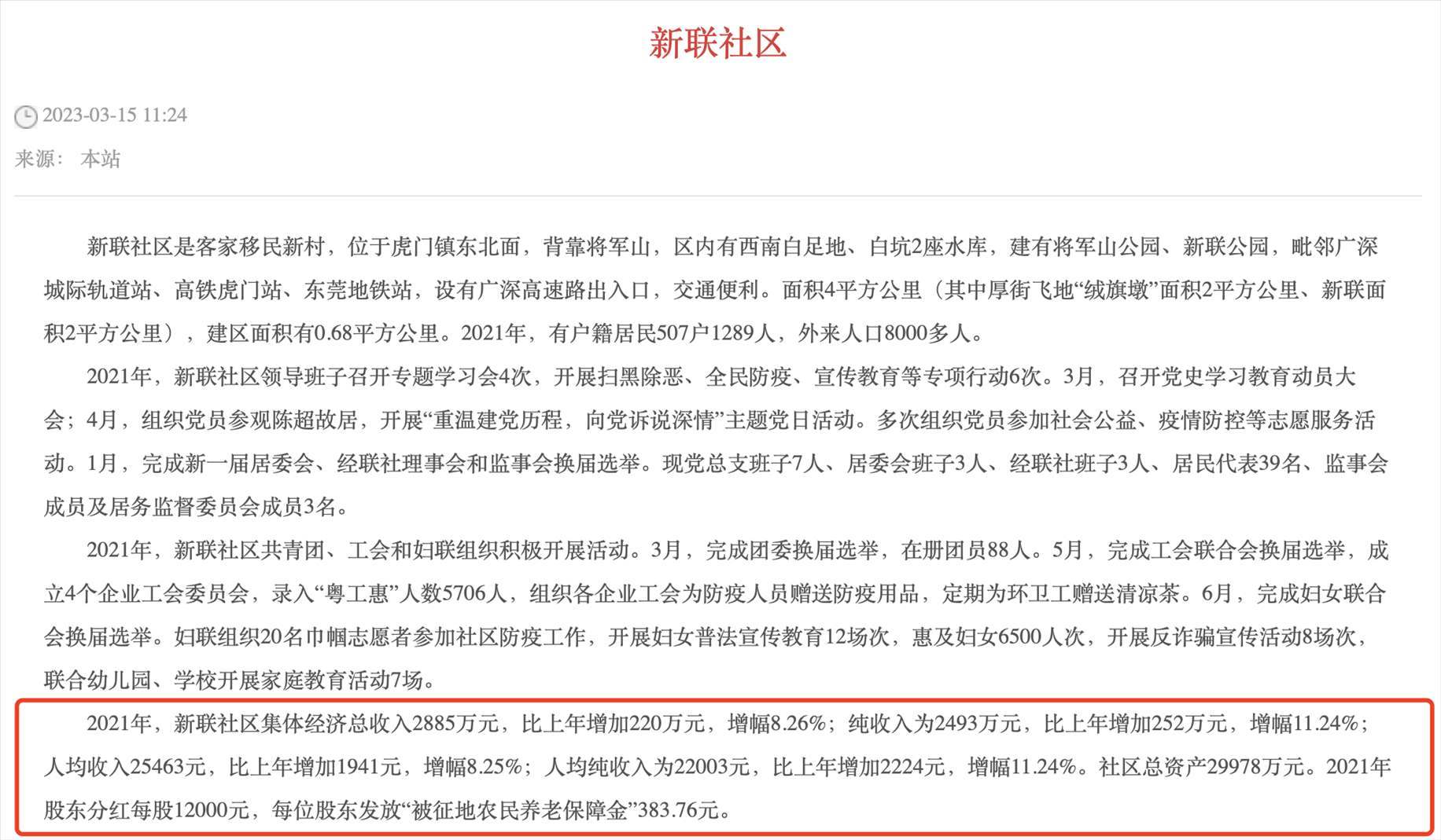 官網(wǎng)信息表明,2021年,新聯(lián)社區(qū)集體經(jīng)濟(jì)總收入已達(dá)到2885萬(wàn)元,比上年增加220萬(wàn)元,增幅8.26%;純收入為2493萬(wàn)元,比上年增加252萬(wàn)元,增幅11.24%。