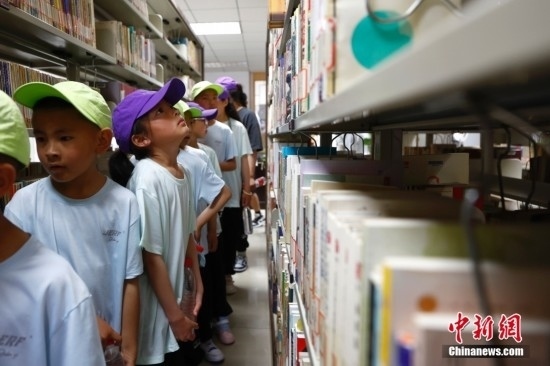 圖為一個(gè)藏族女孩抬頭望向書架。富田攝
