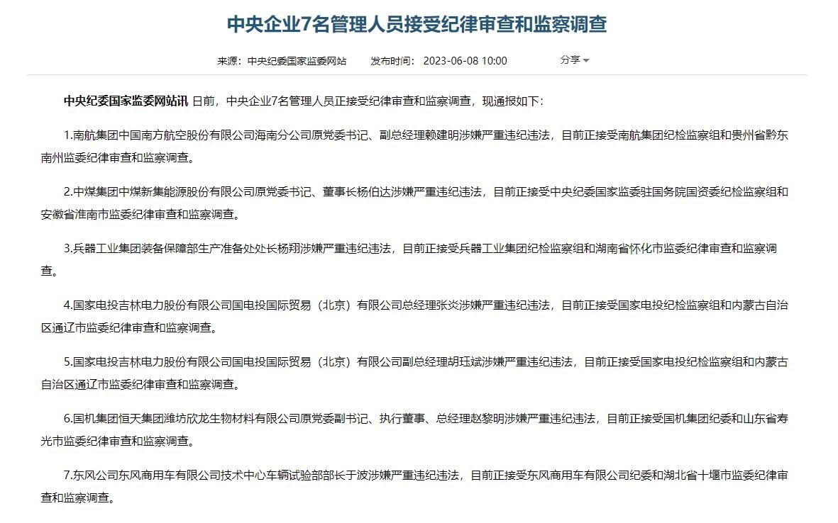 ·中央企業(yè)7名管理人員接受紀律審查和監(jiān)察調查。