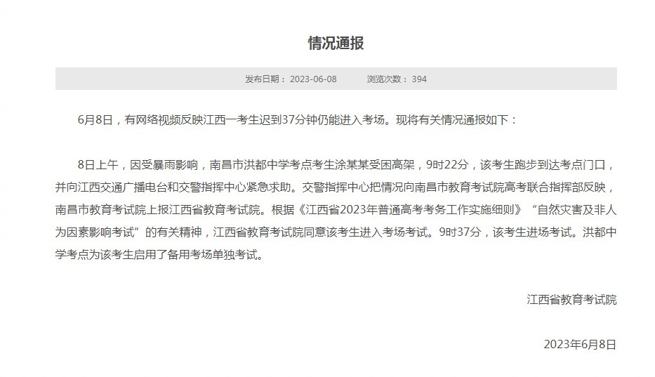 ·江西省教育考試院通報“一考生遲到37分鐘仍能進入考場”。