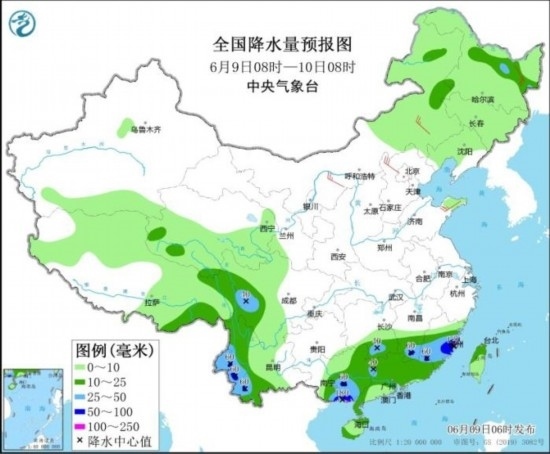 9日至11日,江南、華南、云南等地有中到大雨,局地有暴雨或大暴雨,小時(shí)雨量20~50毫米,局地可達(dá)60毫米以上;預(yù)計(jì)6月9日08時(shí)至10日08時(shí),廣西南部和東北部、湖南南部、江西南部、福建中南部、廣東西北部、云南西部、四川西部等地部分地區(qū)有大到暴雨,其中,福建東部沿海、廣西東南部沿海等地局地有大暴雨(100~180毫米)。上述部分地區(qū)伴有短時(shí)強(qiáng)降水,局地有雷暴大風(fēng)或冰雹等強(qiáng)對流天氣。中央氣象臺(tái)6月9日06時(shí)繼續(xù)發(fā)布暴雨藍(lán)色預(yù)警(見圖1)。
