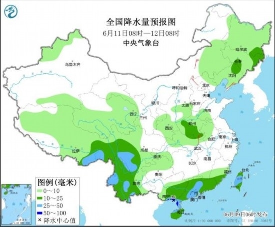 6月10日08時(shí)至11日08時(shí),內(nèi)蒙古東北部、遼寧東部、吉林東南部、西藏東部、青海東南部、四川西部、云南西部、廣西東部和南部、廣東、福建南部、海南島、臺(tái)灣島西部等地部分地區(qū)有中到大雨,其中,廣西東南部沿海、福建南部、廣東西南部等地局地有暴雨或大暴雨(100~150毫米)。內(nèi)蒙古中部、黑龍江北部、河北西北部等地部分地區(qū)有4~6級(jí)風(fēng)(見圖3)。