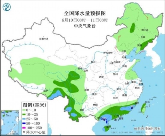 圖2 全國降水量預(yù)報(bào)圖(6月9日08時(shí)-10日08時(shí))
