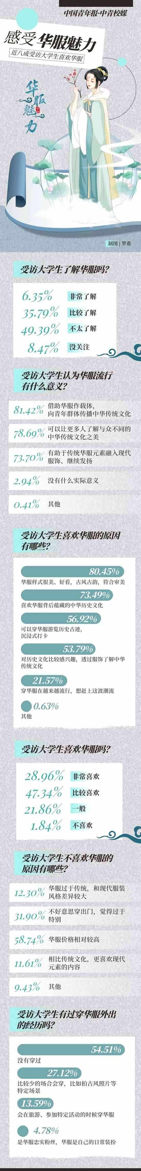 穿華服正在成為一些年輕人旅游或日常出行的選擇?!叭A服”,是指具有中華民族歷史文化基因、精神風(fēng)貌,且融合當(dāng)代審美的禮儀性服裝,其服裝風(fēng)格根植于中華傳統(tǒng)文化,傳承中華民族特質(zhì),體現(xiàn)當(dāng)代社會(huì)積極向上的時(shí)代精神,具有鮮明的辨識(shí)度,適用于國(guó)際交往、文化交流、商貿(mào)往來以及日常節(jié)慶、典祭等禮儀場(chǎng)合。自2018年起,每年的農(nóng)歷三月初三被選定為“中國(guó)華服日”,在前不久結(jié)束的第五屆“中國(guó)華服日”活動(dòng)中,上萬名青年華服愛好者匯聚活動(dòng)現(xiàn)場(chǎng)參與體驗(yàn)。近日,中國(guó)青年報(bào)社·中青校媒面向全國(guó)高校大學(xué)生發(fā)起問卷調(diào)查,共回收117所高校學(xué)生填寫的有效問卷1464份。調(diào)查結(jié)果顯示,76.30%受訪者表示喜歡華服,42.14%受訪者表示對(duì)華服有一定的了解。