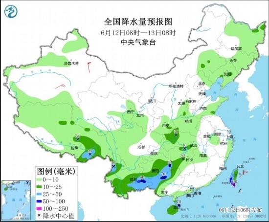 圖2 全國降水量預報圖(6月12日08時-13日08時) 圖片來源:中央氣象臺網站