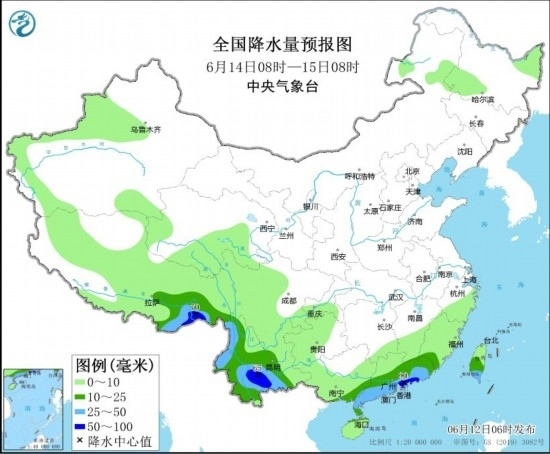 6月13日08時至14日08時,云南南部、廣西南部和東部、廣東大部、臺灣島中南部、西藏東南部等地有大雨,局部地區(qū)有暴雨(50~90毫米)。新疆東部等地有5~6級風(見圖3)。