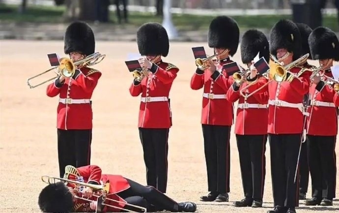 ·氣溫30度頭頂熊皮帽,三名衛(wèi)兵在英國(guó)王生日游行彩排被熱暈。