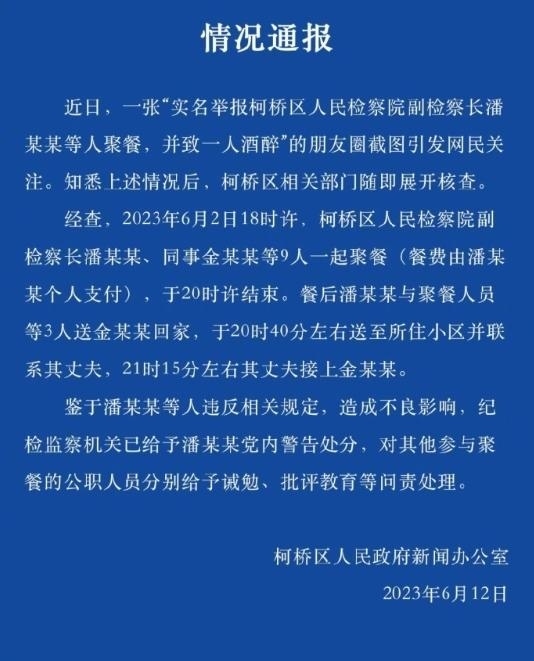 ·紹興一男子舉報(bào)妻子被上司帶去酒局遭灌酒,官方回應(yīng):給予處分。