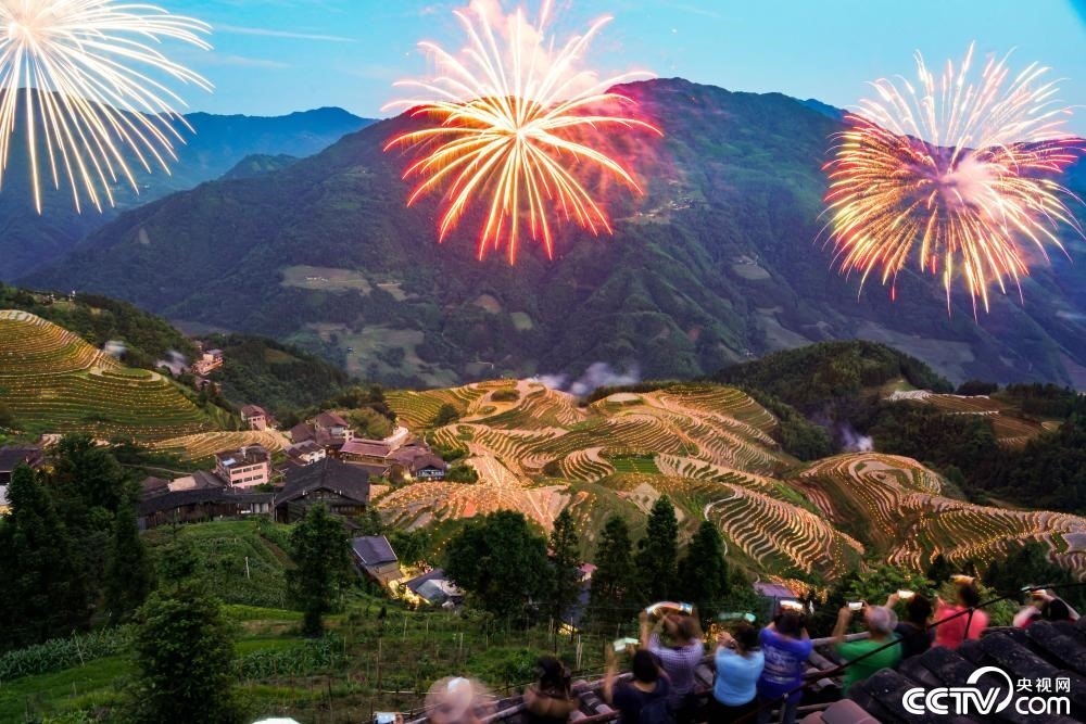 2023年6月10日,廣西桂林,龍勝龍脊梯田景區(qū)舉行一年一度的梳秧節(jié)。夜幕降臨,景區(qū)內(nèi)層層疊疊的梯田里星星點(diǎn)點(diǎn)的火把漸漸亮起,絢麗煙花在空中綻放,景色如畫(huà)。