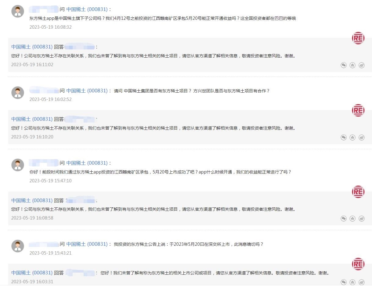 中新財經(jīng)注意到,有投資者曾在互動平臺上向中國稀土詢問“東方稀土”相關(guān)信息,從提問內(nèi)容看,可能已有投資者被誤導(dǎo)受騙。比如,“東方稀土APP是中國稀土旗下子公司嗎?我們4月12號之前投資的江西贛南礦區(qū)承包5月20號能正常開通收益嗎?”“我投資的東方稀土公告上說:于2023年5月20曰在深交所上市,此消息確切嗎?”等等。