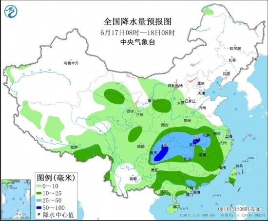 全國(guó)降水量預(yù)報(bào)圖(6月17日08時(shí)-18日08時(shí))圖自中央氣象臺(tái)網(wǎng)站