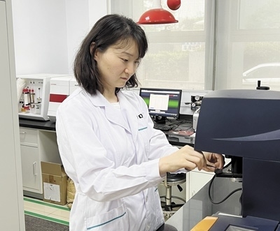 南京市產(chǎn)品質(zhì)量監(jiān)督檢驗院綠色可降解材料質(zhì)檢中心副主任朱南幫企業(yè)做測試實驗。蔣若晗攝