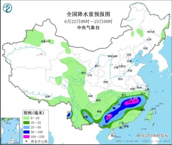 圖3 全國(guó)降水量預(yù)報(bào)圖(6月22日08時(shí)-23日08時(shí)) 圖自中央氣象臺(tái)網(wǎng)站