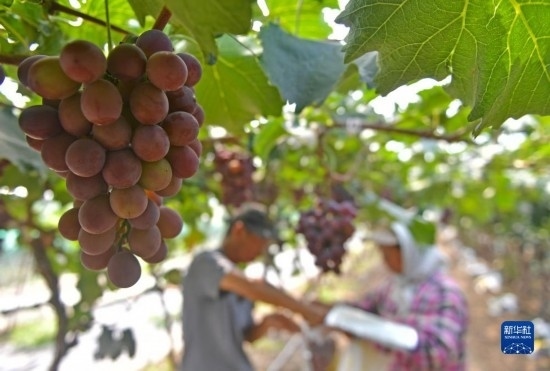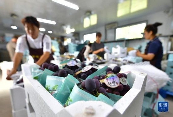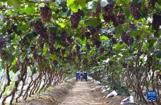 近日,遼寧省燈塔市種植的遼峰葡萄喜迎豐收。燈塔市出產(chǎn)的遼峰葡萄遠近聞名,目前種植面積約1萬畝。當?shù)匾研纬善咸雅嘤?、種植、銷售、倉儲、加工相關產(chǎn)業(yè)鏈,葡萄是當?shù)剞r(nóng)民致富增收的特色產(chǎn)業(yè)。