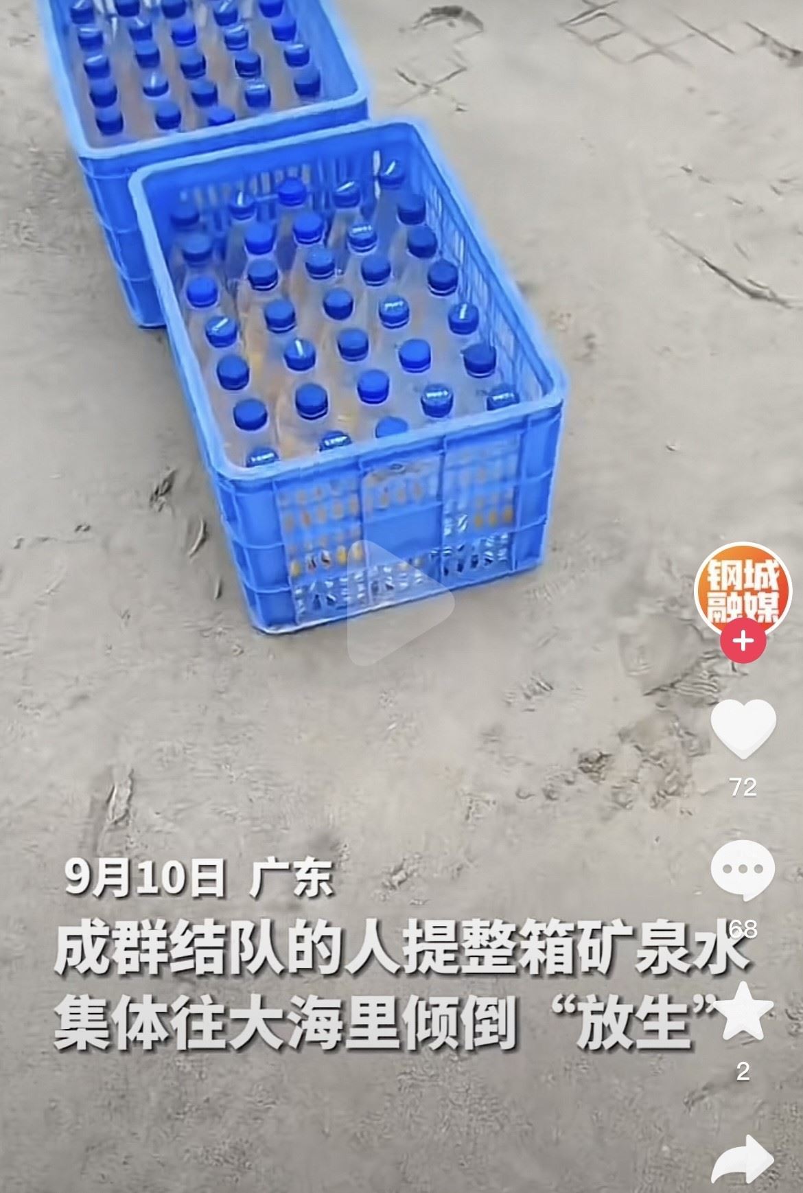 近日,有網(wǎng)友在社交平臺(tái)發(fā)布稱(chēng),廣東汕尾湖東港有一群人往海里“放生”礦泉水,60多箱礦泉水被浪費(fèi)?,F(xiàn)場(chǎng)視頻顯示,一群人抬著藍(lán)色的箱子正往海邊走,箱子里可見(jiàn)擺放整齊的礦泉水瓶。視頻發(fā)布者介紹,9月10日下午3點(diǎn)多來(lái)了兩輛大巴,大巴上坐滿(mǎn)了人。