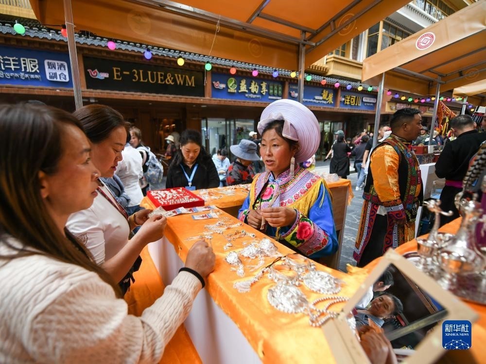 9月15日,在四川省阿壩藏族羌族自治州馬爾康市嘉絨特色街區(qū),游客在非遺集市上選購(gòu)商品。