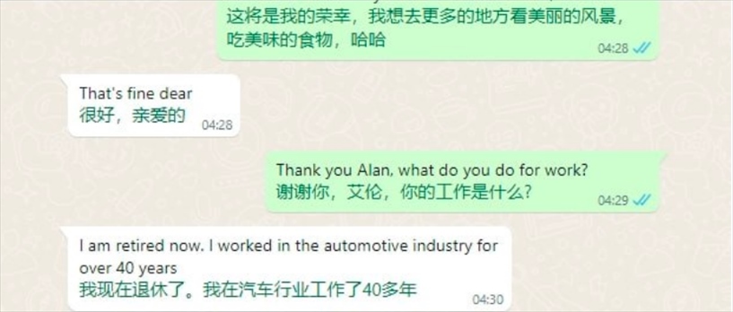 這個過程被他們稱為“切客”。張先生說,他們一般會通過分享新聞將對話引導(dǎo)到經(jīng)濟(jì)狀況的話題,然后進(jìn)一步觀察對方有沒有投資的興趣?!叭绻磻?yīng)很好的話,就直接引導(dǎo)他去投資,如果不好就繼續(xù)聊感情?!?/p>