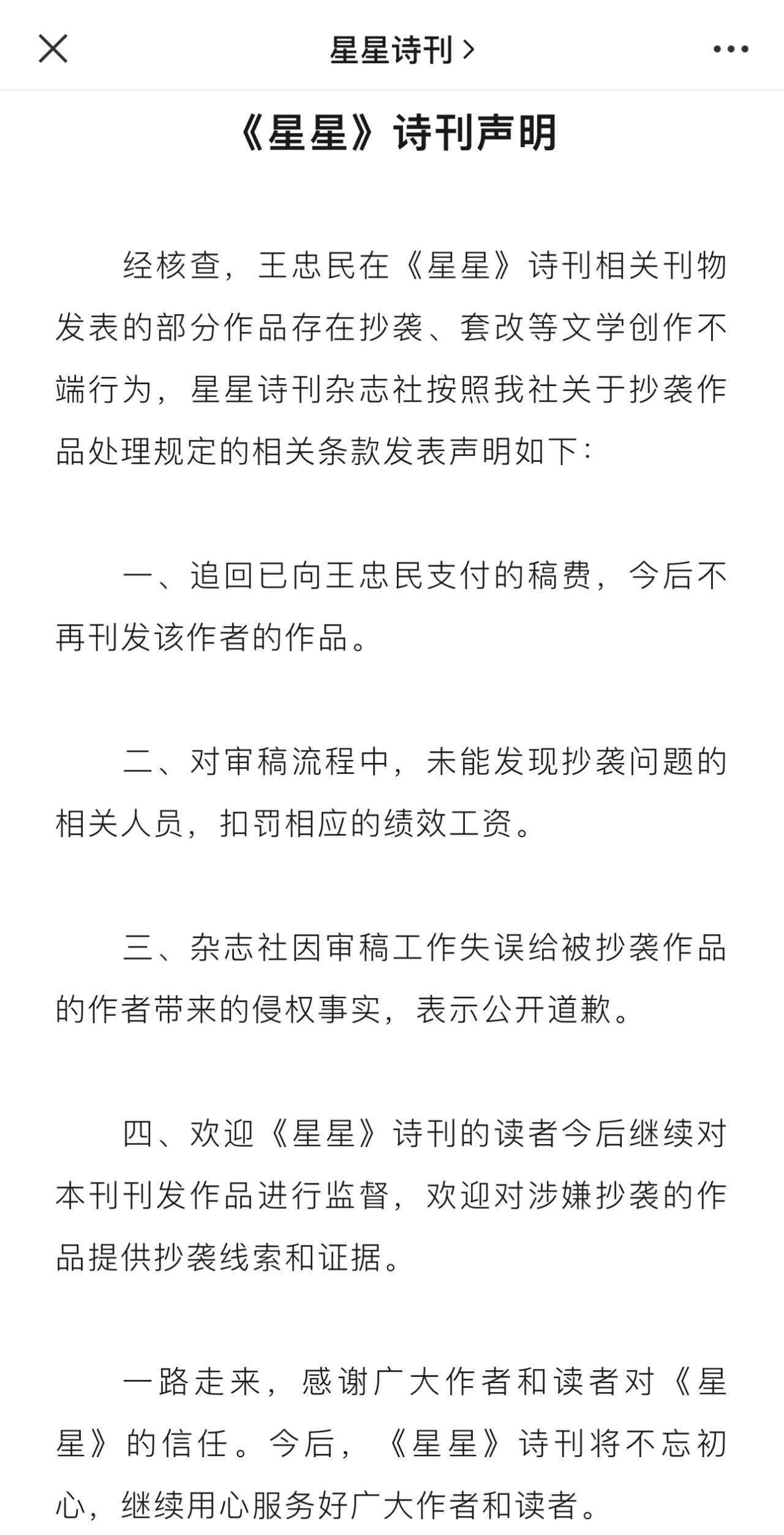 《星星》詩刊雜志社稱,按照該社關(guān)于抄襲作品處理規(guī)定的相關(guān)條款,追回已向王忠民支付的稿費(fèi),今后不再刊發(fā)該作者的作品;對審稿流程中,未能發(fā)現(xiàn)抄襲問題的相關(guān)人員,扣罰相應(yīng)的績效工資。