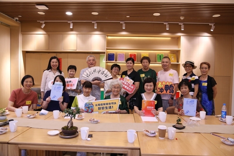 她希望能給他們提供彼此支持、交流經(jīng)驗(yàn)的社交平臺(tái)。而她也漸漸發(fā)現(xiàn)最了解家屬需求的是他們自己。為什么不能由家屬自己來(lái)決定討論什么呢?于是,2020年,汪達(dá)民與顧春玲一拍即合,在延續(xù)國(guó)外“記憶咖啡館”理念的基礎(chǔ)上,開(kāi)創(chuàng)了本土特色的認(rèn)知癥家屬互助平臺(tái):照護(hù)茶館。畢竟,茶館就是熱鬧的、七嘴八舌的,人們來(lái)這里消遣娛樂(lè),釋放壓力。在照護(hù)茶館里,家屬們既是掌柜也是茶客,分享各種照護(hù)信息,這也是認(rèn)知癥患者照護(hù)者們希望得以喘息的方式。