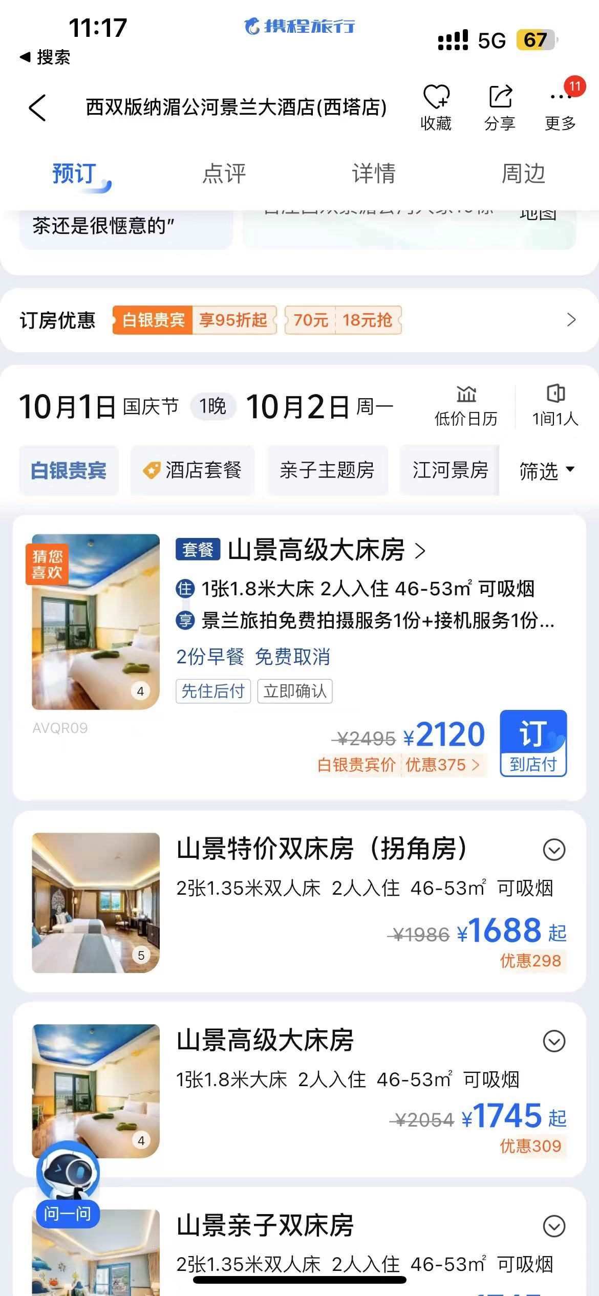 ▲西雙版納湄公河景蘭大酒店的“山景高級大床房”,在10月1日入住、10月2日退房,標(biāo)價為2120元