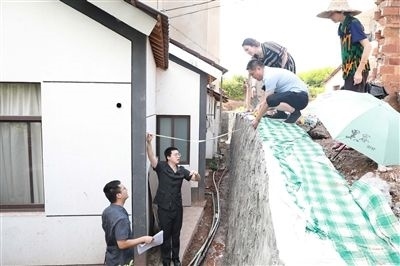 執(zhí)行干警丈量排水溝寬度。