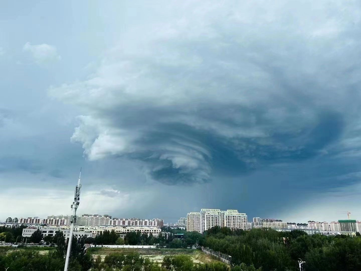 7月6日14時左右,通遼市科爾沁區(qū)上空出現(xiàn)超級單體風(fēng)暴,只見巨型氣旋籠罩在上空,直逼地面,猶如電影特效,不少市民被這壯觀的景象震撼到。