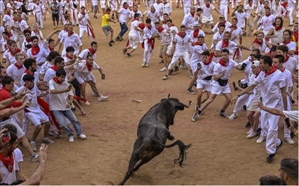 當(dāng)?shù)貢r(shí)間2023年7月10日,西班牙潘普洛納,圣費(fèi)爾明節(jié)期間,狂歡者站在公牛周圍,公牛進(jìn)入斗牛場。