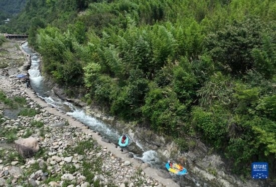 7月11日,人們在杭州臨安龍崗鎮(zhèn)浙西大龍灣體驗峽谷漂流(無人機照片)。