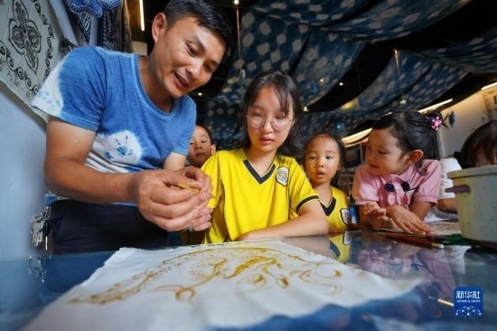 7月12日,在貴州省丹寨縣萬達小鎮(zhèn)一家苗族蠟染非遺體驗館,小朋友在非遺傳承人的指導下畫蠟畫。