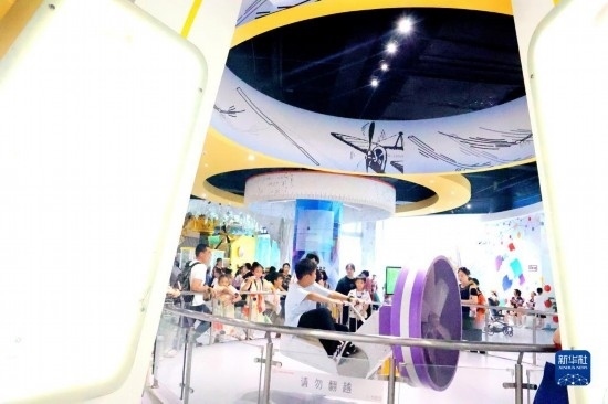 7月12日,小朋友在浙江省科技館里參觀體驗。