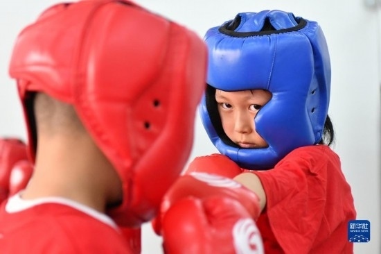 7月12日,小朋友在山東省煙臺市福山區(qū)一家搏擊訓練館進行搏擊訓練。