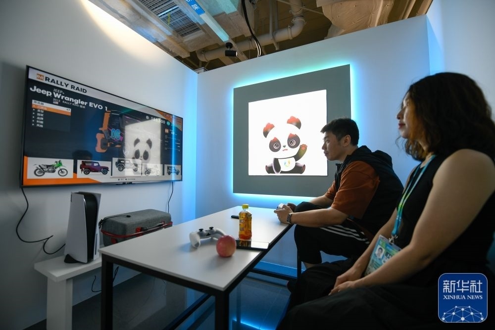 ↑7月14日,媒體工作人員在成都大運(yùn)會(huì)主媒體中心休閑娛樂區(qū)內(nèi)游玩。新華社記者 胥冰潔 攝