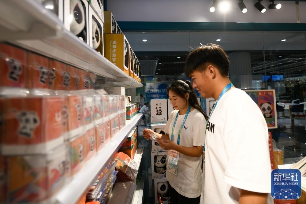 ↑7月14日,媒體工作人員在成都大運(yùn)會(huì)主媒體中心大運(yùn)會(huì)官方特許商品零售店內(nèi)選購(gòu)紀(jì)念品。新華社記者 胥冰潔 攝