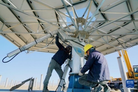 7月21日,在阿克塞千萬千瓦級(jí)可再生能源多能互補(bǔ)基地,工人在匯東新能源75萬千瓦光熱+項(xiàng)目建設(shè)現(xiàn)場(chǎng)安裝定日鏡。新華社發(fā)(馬曉偉 攝)