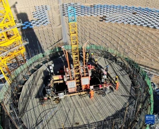 7月21日,在阿克塞千萬千瓦級(jí)可再生能源多能互補(bǔ)基地,工人在匯東新能源75萬千瓦光熱+項(xiàng)目建設(shè)現(xiàn)場(chǎng)施工。新華社發(fā)(馬曉偉 攝)