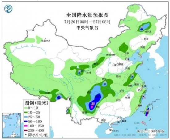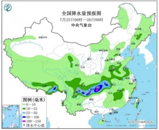 預(yù)計,7月25日08時至26日08時,重慶中南部、四川南部、云南東北部、貴州北部、湖南西北部、湖北西部以及江蘇北部、西藏東南部、臺灣島東部等地的部分地區(qū)有大到暴雨,其中,重慶東南部、四川南部、貴州北部等地局地有大暴雨(100~150毫米)(見圖1);上述部分地區(qū)伴有短時強降水(最大小時降雨量20~50毫米,局地可超過70毫米),局地有雷暴大風(fēng)等強對流天氣。中央氣象臺7月25日06時繼續(xù)發(fā)布暴雨藍(lán)色預(yù)警。