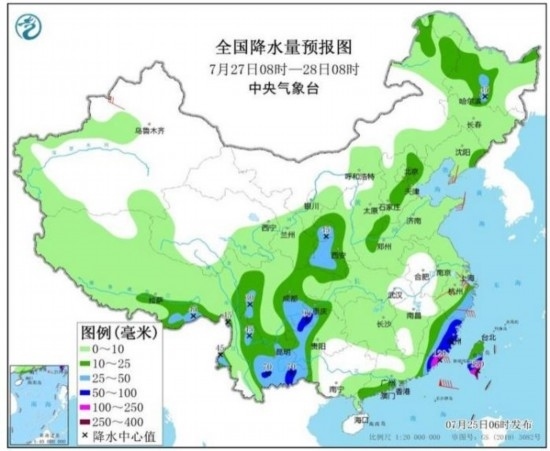 圖3 全國降水量預(yù)報圖(7月25日08時-26日08時)