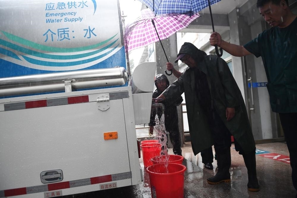7月31日傍晚,門頭溝區(qū)上岸療養(yǎng)院工作人員在應急供水車處取水。新華社記者 鞠煥宗 攝