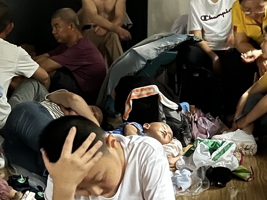汗味兒、腳臭味兒、霉味兒攪和在一起,溫宇被“熏得頭暈”。室內的椅子被搶占一空,講演臺上睡滿了打地鋪的乘客。幾乎所有人都表情木然,“累得不想說話”。