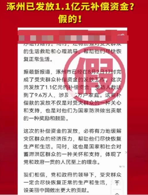 近日,網(wǎng)傳消息稱“河北省涿州市已經(jīng)在8月2日完成了1.1億受災(zāi)群眾補(bǔ)償資金的發(fā)放工作,受益人數(shù)達(dá)到了9.6萬(wàn)人,涉及3.5萬(wàn)戶家庭”。