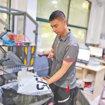 午后,湖北順豐速運有限公司武漢唐家墩網(wǎng)點,張裕和同事們熟練地將大小不一的快遞件分類,裝入不同的袋子中。每裝滿一個編織袋,張裕就在袋口下方貼上二維碼,再用機器掃描登記,確認無誤后裝車發(fā)運。