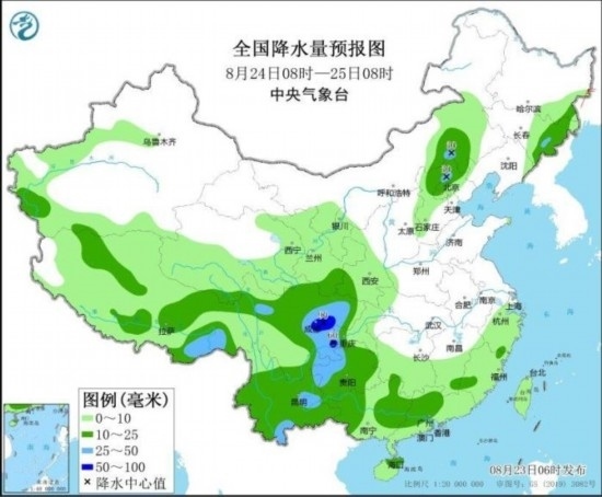 全國降水量預(yù)報(bào)圖(8月24日08時-25日08時)