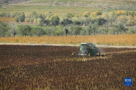 10月1日,在沽源縣白土窯鄉(xiāng)小西溝村,當(dāng)?shù)剞r(nóng)機(jī)手王永成在操作收割機(jī)收獲藜麥。