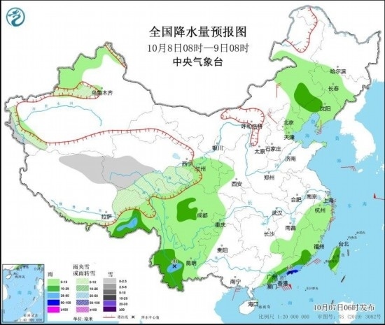 圖2 全國降水量預報圖(10月8日08時-9日08時)