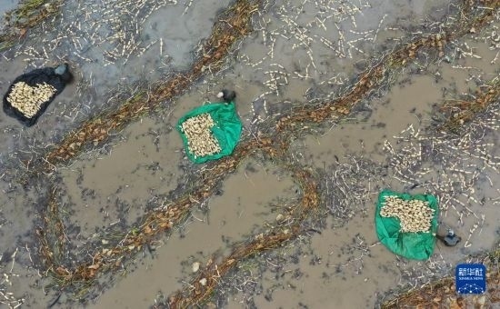 10月5日,河北省新河縣西流鄉(xiāng)西董村一家蓮藕種植合作社的社員在收獲蓮藕(無(wú)人機(jī)照片)。
